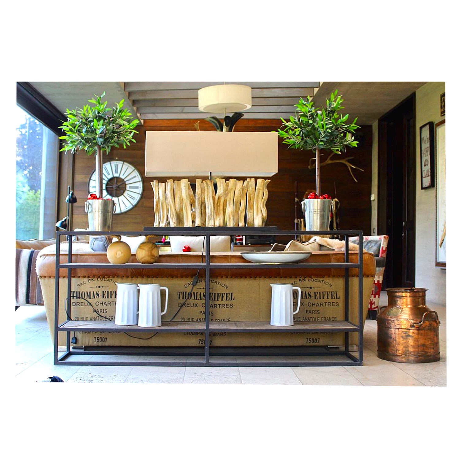 Arrimo con cubierta de madera parquet y patas de fierro. Tiene 3 repisas.