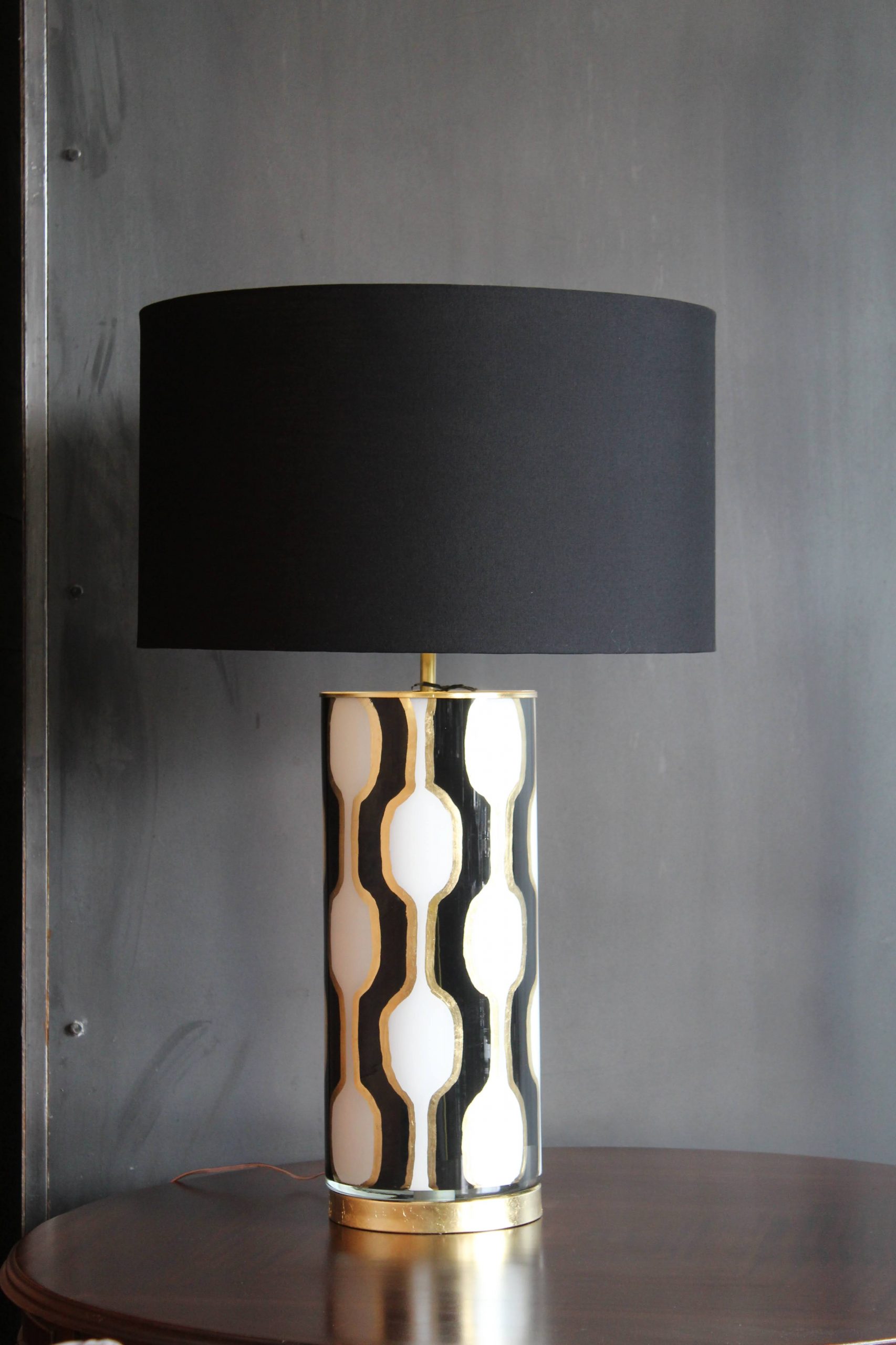 Lámpara de Mesa de vidrio moderna, diseño greco, blanco, negro y dorado.