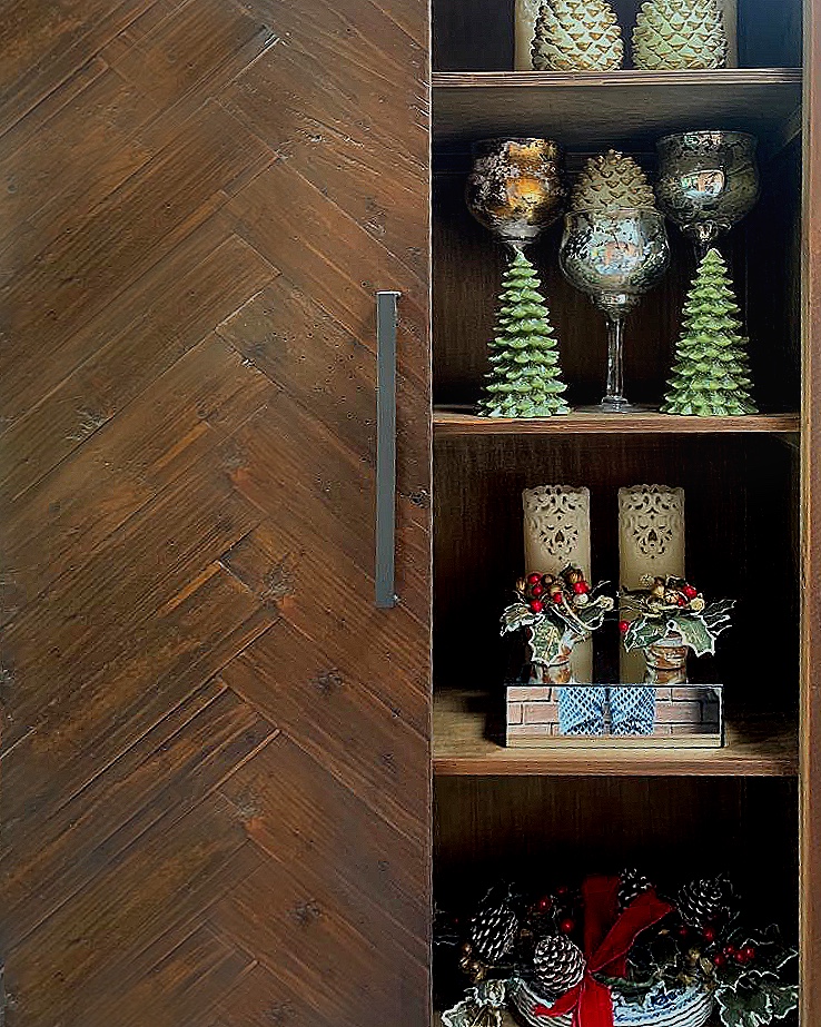 Mueble licorero rústico madera parquet, con detalles de madera diagonal.